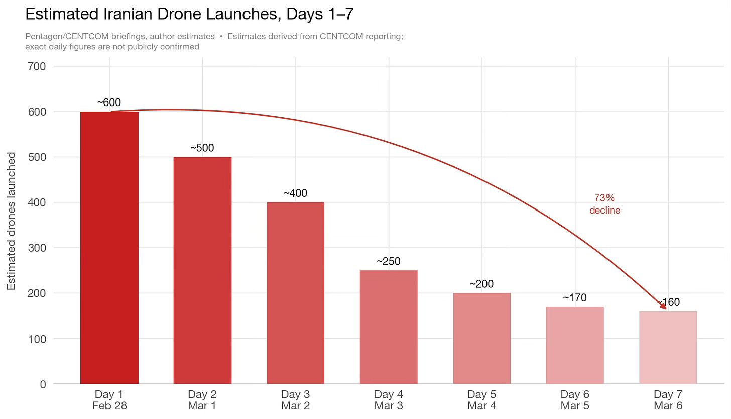 Then the tempo dropped. Pentagon briefings reported that Iranian one-way attack drone launches fell 73% from Day 1 levels, while ballistic missile shots declined 86%. That drop is the most important data point of the war’s first week, and the least understood. It could mean Iran is running low. It could mean that US and Israeli strikes have degraded launch infrastructure. It could mean Iran is deliberately pacing itself, shifting from shock-value saturation to a sustainable harassment tempo. It could be some combination of all three. The honest answer is that no one outside of IRGC operational planning knows which explanation carries the most weight, and anyone who tells you they know for certain is guessing.