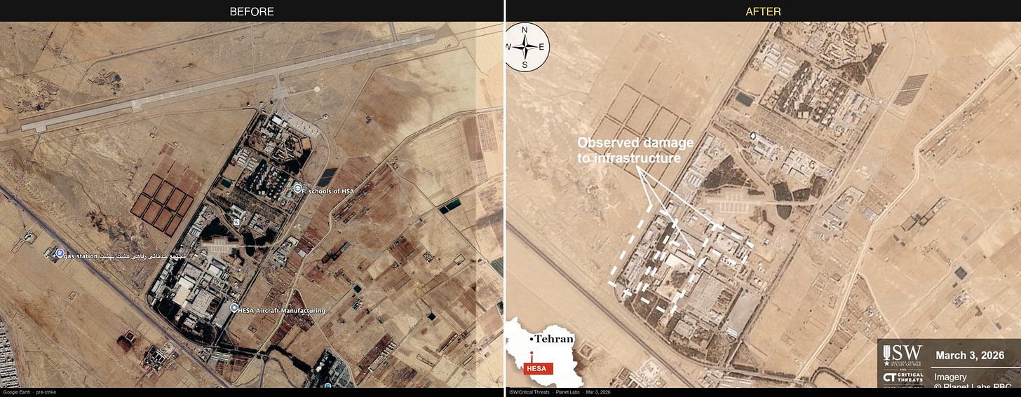 Strikes caused real damage: satellite imagery showed several damaged buildings at HESA’s Shahin Shahr complex, Iran’s main production site for Ababil and Shahed-series drones. Other strikes also hit Shahed-linked facilities in Isfahan, cratered the runway at the Ali Akbar Drone Base in Ahvaz, set IRIS Shahid Bagheri ablaze, and hit Parchin east of Tehran.