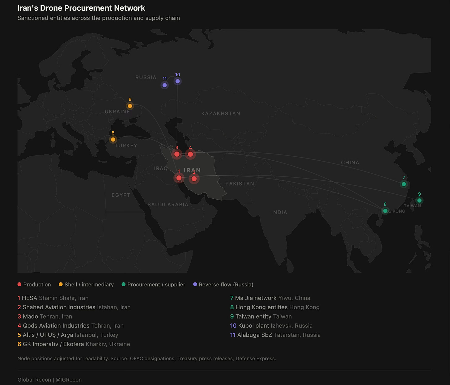 This is where the factory strike model is weakest. Iran’s drone industry does not survive on domestic production alone. It depends on an external procurement network that sources machine tools, electronics, navigation components, sensors, and other dual-use items through layers of intermediaries.