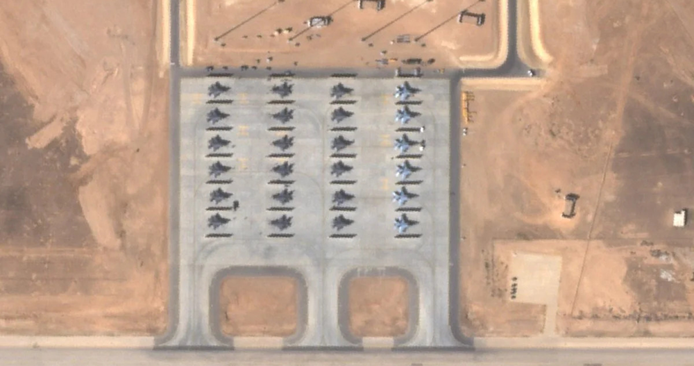 At least 70 military aircraft visible at Muwaffaq Salti Air Base, Jordan. Military analysts estimate the current configuration could enable up to approximately 800 sorties per day at peak capacity.