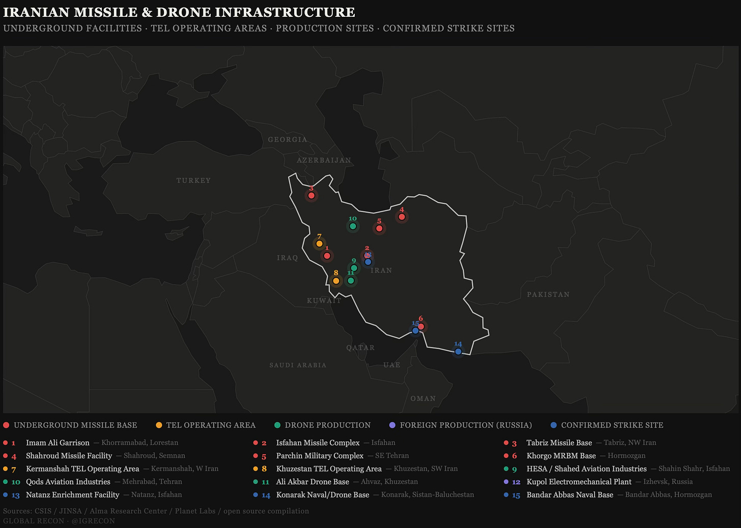 The best-documented site is the Khorramabad complex (Imam Ali Garrison) in Lorestan Province: at least eight tunnels and launch shafts carved into the Sefid Kouh Mountains, with a storage facility and an operational launch facility connected by automated railway systems that move missile magazines into firing position. The Alma Research Center published detailed analysis of this site after the IDF struck it during the June 2025 Twelve-Day War. B-2s have hit underground facilities in the current campaign with 2,000-pound bunker-busters.