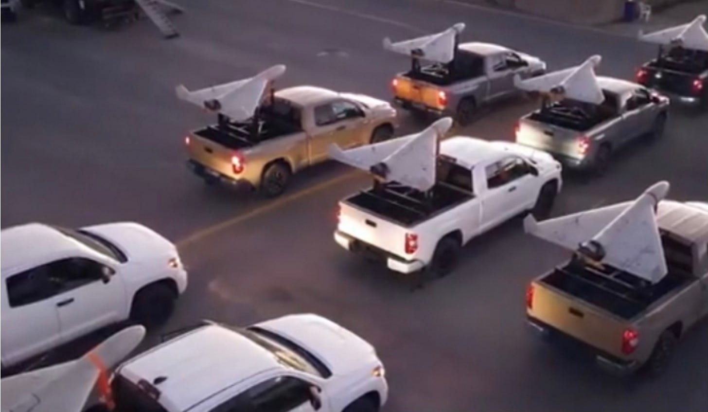 A launch crew can park a loaded truck in a garage, a forest clearing, or an underground parking structure, fire ten drones in under two minutes, and relocate before overhead ISR can fix the position. There are no preparation signatures that distinguish a warehouse full of Shaheds from an empty one. CENTCOM has released footage of strikes destroying launch sites caught in active configuration, drones visibly aligned on rails. Those were the ones they found.