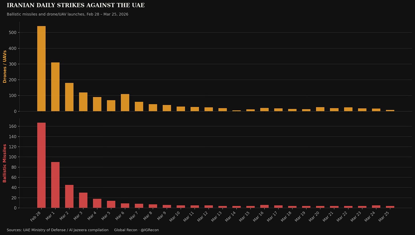 Three weeks into Operation Epic Fury, the Pentagon says Iran’s ballistic missile capacity is “functionally destroyed.” The White House claims 83 percent of drone launches have been suppressed. The IDF reports more than 400 missile launchers eliminated. And yet, on March 26, the UAE Ministry of Defense confirmed it intercepted 15 ballistic missiles and 11 drones launched from Iran, the conflict’s 27th consecutive day of strikes against the Emirates.