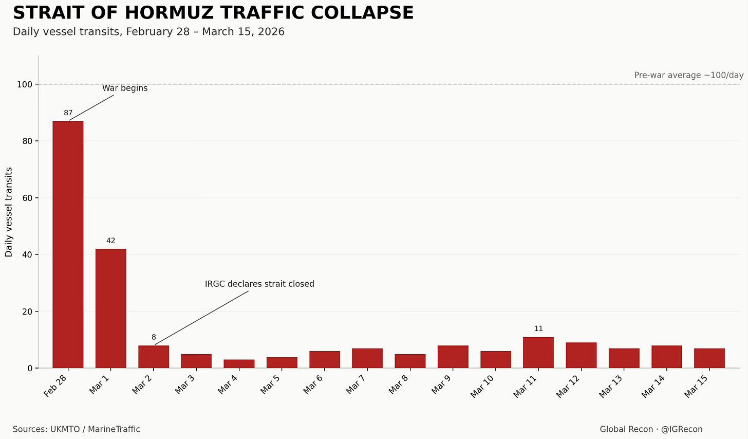 A version of the Malacca dilemma is playing out right now at a different chokepoint. After U.S. and Israeli strikes on Iran beginning in late February 2026, the IRGC attacked vessels transiting the Strait of Hormuz. Commercial traffic collapsed. According to UK Maritime Trade Operations data reported by the Anadolu Agency, only one commercial vessel passed through the strait on March 7. No oil tanker transit was recorded that day.