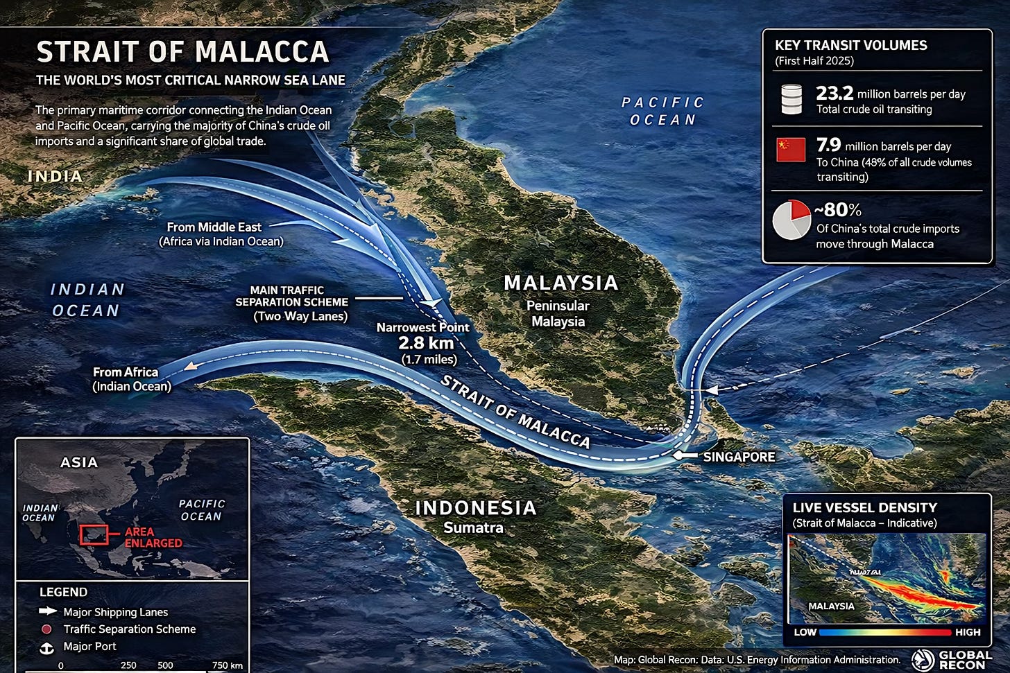 China consumes over 15 million barrels of oil per day. According to U.S. Energy Information Administration data reported by the Malay Mail, 23.2 million barrels per day transited the Strait of Malacca in the first half of 2025. China received 7.9 million barrels per day of crude and condensate through the strait, 48% of all crude volumes transiting the waterway. Around 80% of China’s total crude imports still move through Malacca.