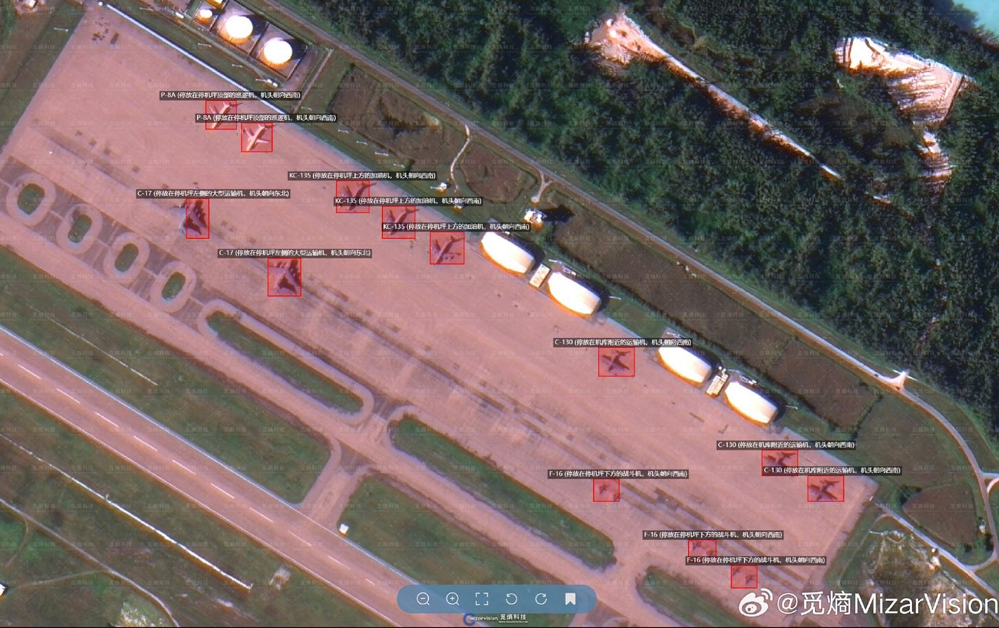 Four days before Operation Epic Fury began, a Chinese geospatial intelligence company with fewer than 200 employees started publishing annotated satellite imagery of U.S. military deployments across the Middle East. The images were high resolution. The annotations were precise. Eleven F-22s at Ovda Air Base in Israel. Eighteen F-35s and six EA-18G Growlers at Muwaffaq Salti in Jordan. Seven E-3 AWACS jets, KC-135 and KC-46 tankers, and E-11 communications aircraft at Prince Sultan in Saudi Arabia. Both carrier strike groups are in theater. The runway assets at Diego Garcia. Several of the facilities and assets catalogued were subsequently struck by Iran.