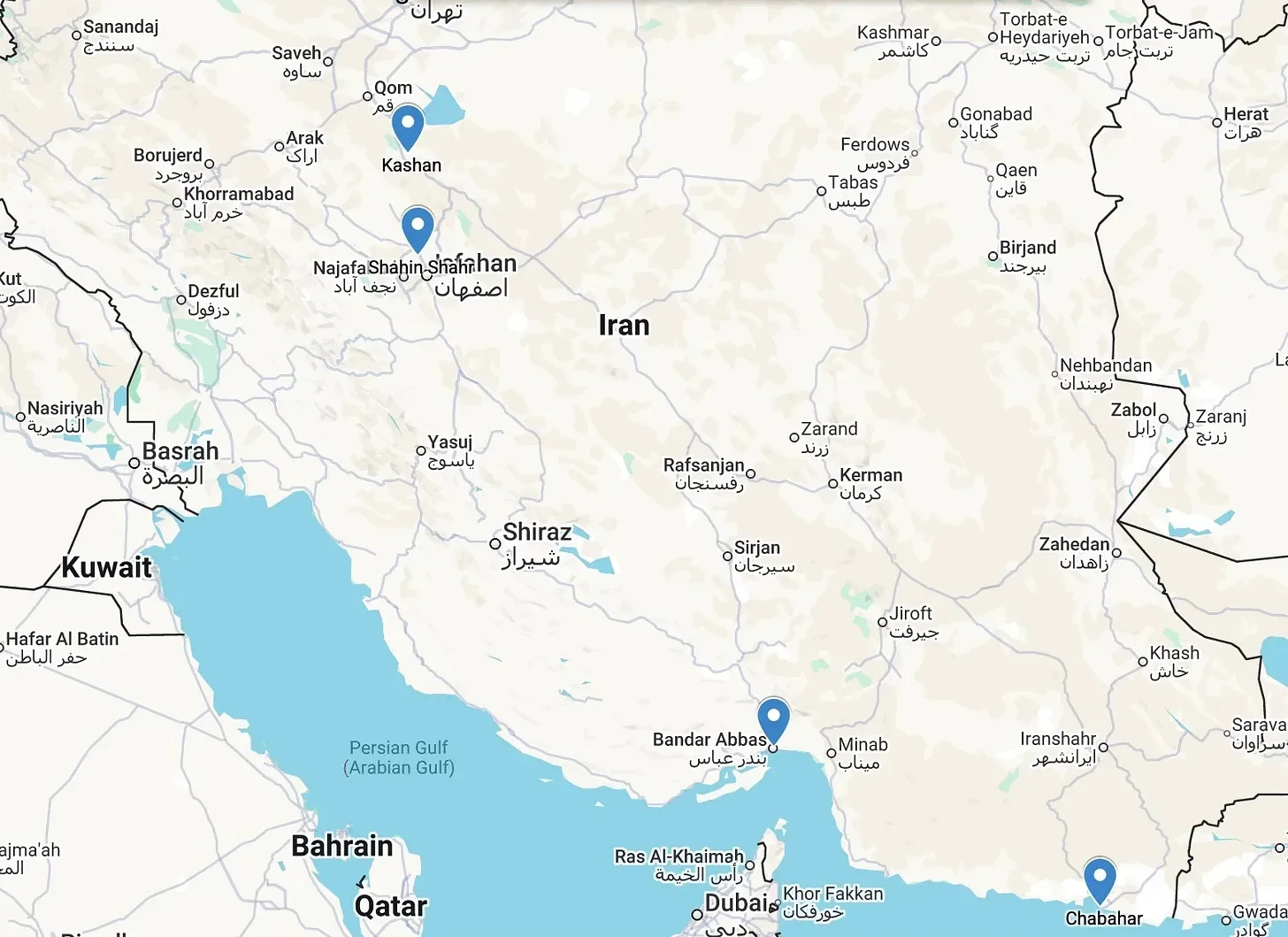 Iran UAV Infrastructure Network — four identified nodes targeted in Operation Epic Fury. Open source mapping via Google My Maps.