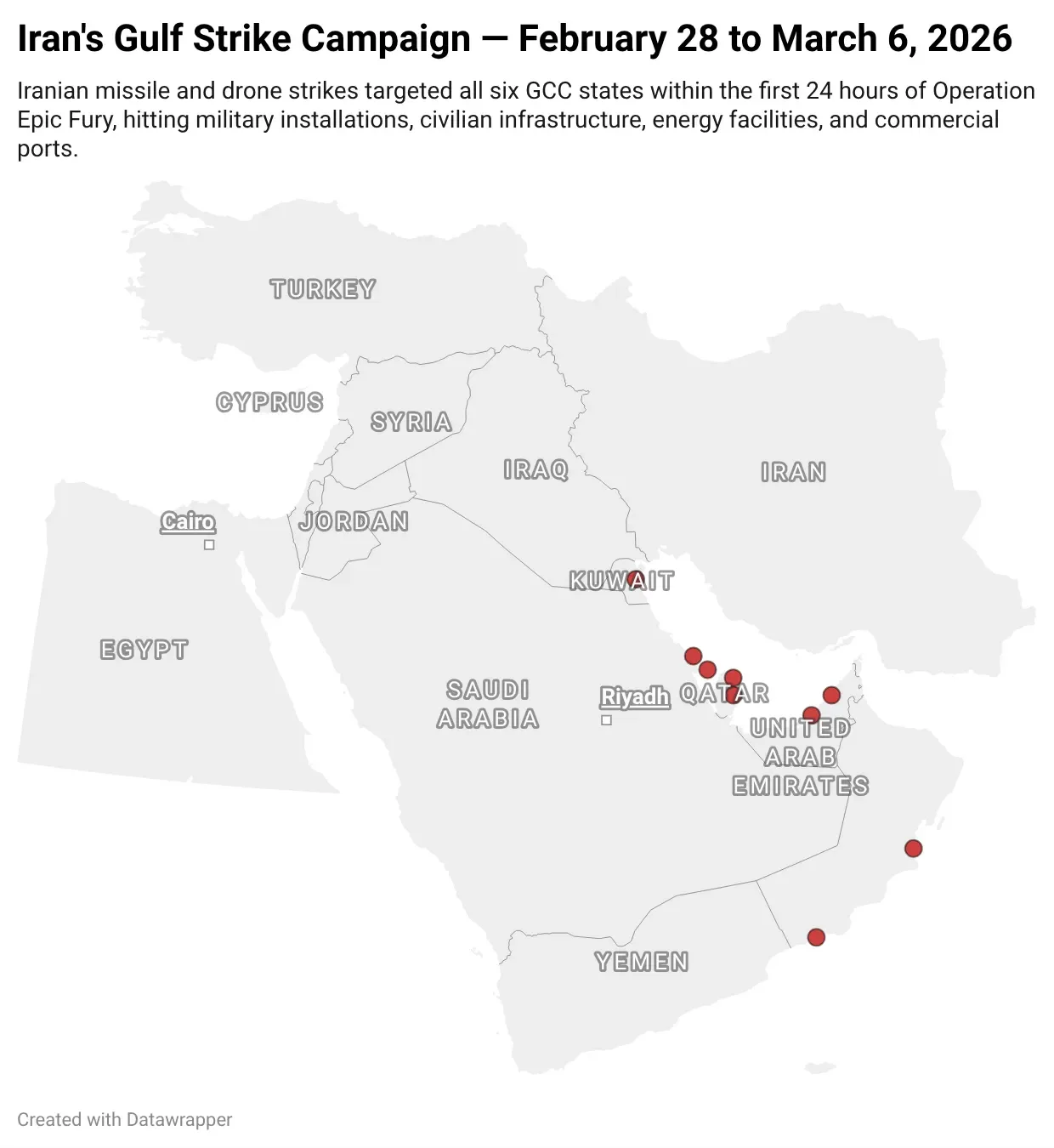 Map: Iranian missile and drone strikes targeted all six GCC states within the first 24 hours of Operation Epic Fury. Interactive version: datawrapper.dwcdn.net/MO50B/1