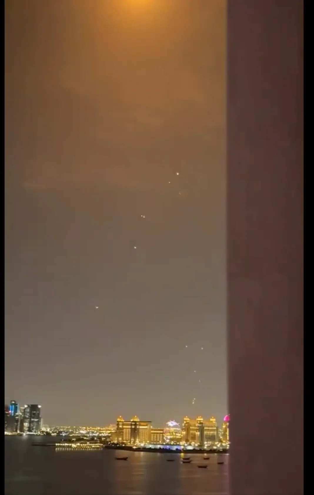Interceptor flares light the sky over Doha, Qatar, March 2026. Qatar's air defenses intercepted 98 of 101 ballistic missiles fired during the campaign. (Source: social media/X)